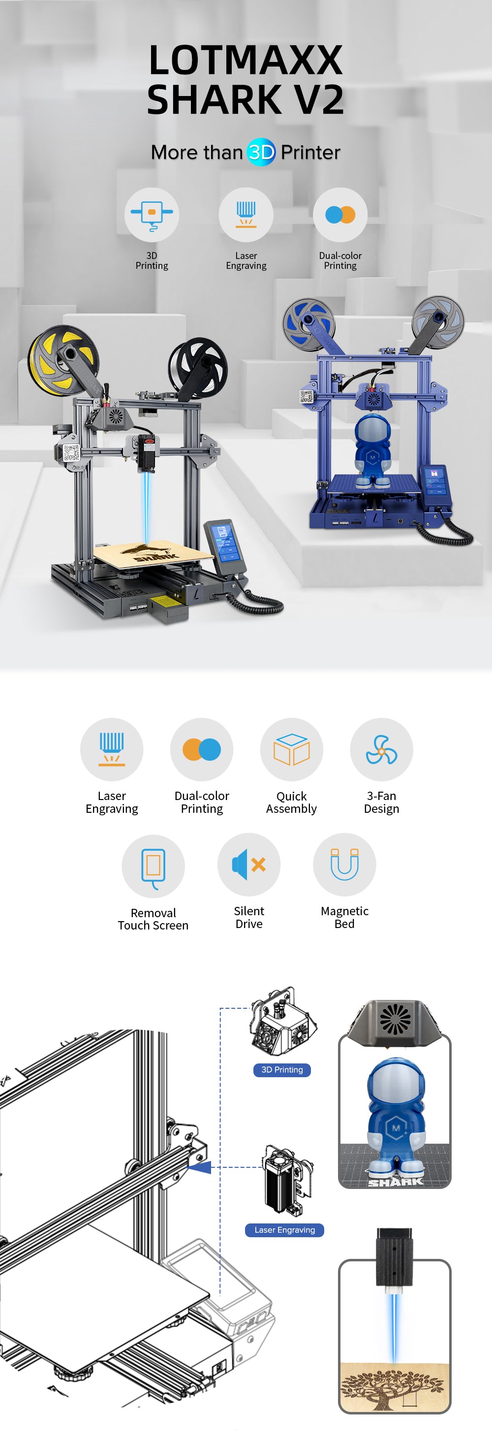 LOTMAXX Shark V2 3D Printer Laser Engraver, Dual Extruder, Laser Engraving & Dual-Color Printing, Magnetic Bed, 235*235*265mm.